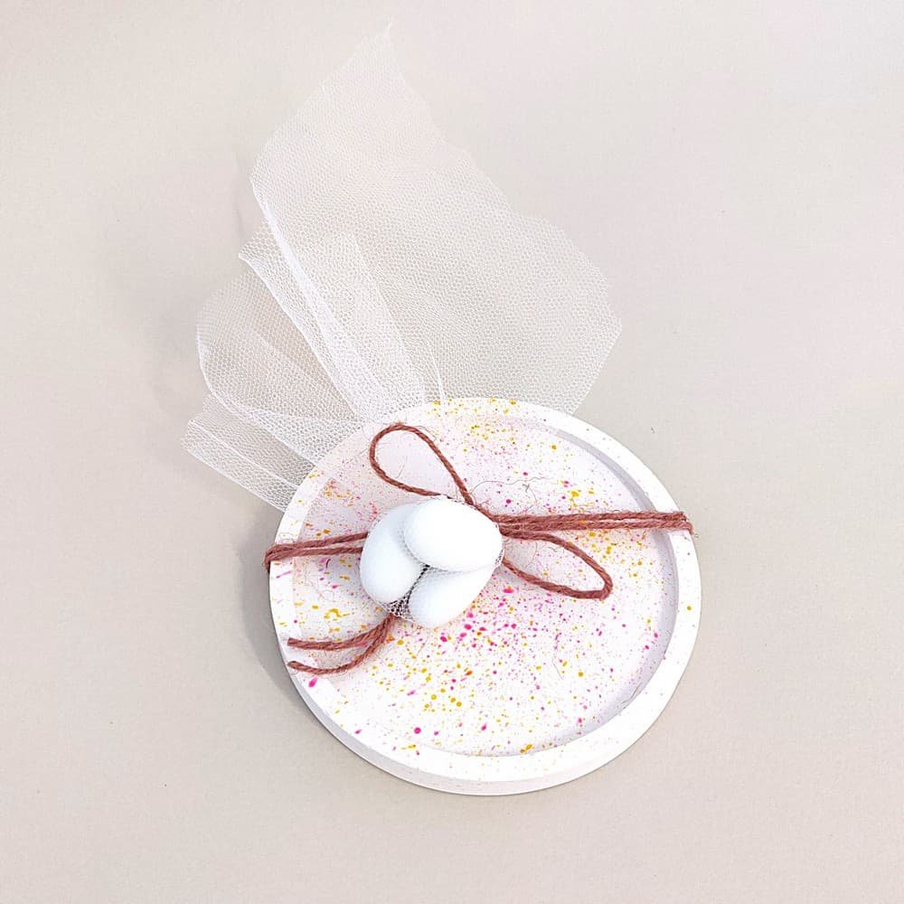 Χειροποίητη μπομπονιέρα σουβέρ από σκόνη πορσελάνης, ιδανική για βάφτιση ή γάμο, που συνδυάζει χρησιμότητα με αισθητική. Το στρογγυλό σουβέρ διακοσμείται με πολύχρωμα στίγματα σε αποχρώσεις της επιλογής σας, δημιουργώντας ένα φρέσκο και χαρούμενο μοτίβο που προσθέτει χρώμα στην κάθε τραπεζαρία.
