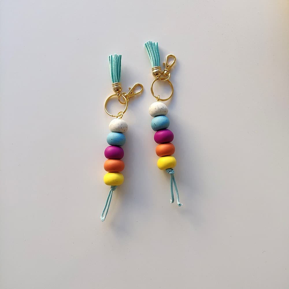 Μπρελόκ με χειροποίητες χάντρες από πολυμερικό πηλό σε ζωηρά χρώματα, περασμένες σε ανθεκτικό κορδόνι.