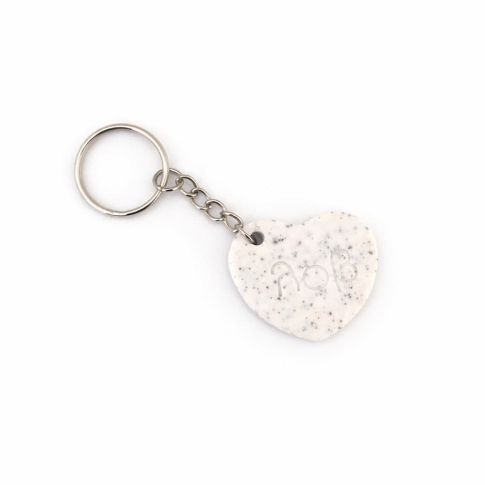 Χειροποίητο μπρελόκ καρδιά από πολυμερικό πηλό σε λευκή, «speckled» υφή, με ανάγλυφα αρχικά για μια διακριτικά προσωποποιημένη πινελιά στην καθημερινότητά σου.