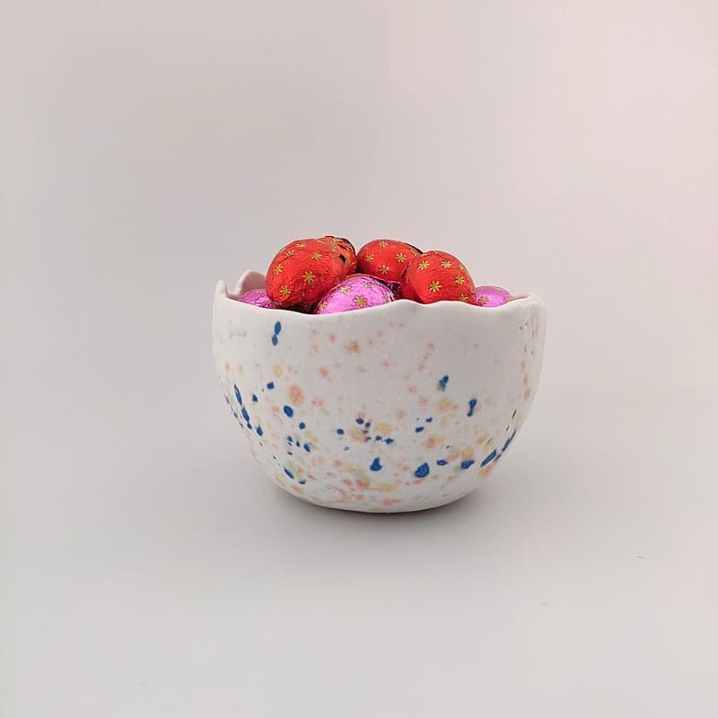 Διακοσμημένο με παστέλ αποχρώσεις σε ροζ, μωβ, μπλε και πράσινο για ελαφρύ, ανοιξιάτικο speckled εφέ – ιδανικό για Πάσχα. Η ματ υφή δίνει φυσική, artisanal αίσθηση.