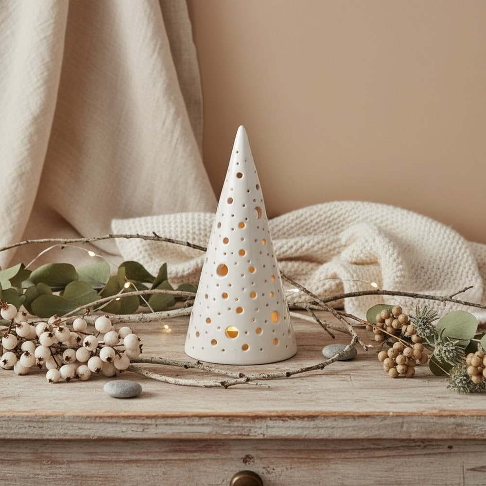 Ένα μοναδικό χειροποίητο κεραμικό δέντρο που συνδυάζει τη γιορτινή ατμόσφαιρα με τη ζεστασιά του φωτός κεριού. Το κωνικό σχήμα του με τις διάτρητες οπές σε διάφορα μεγέθη δημιουργεί ένα μαγευτικό παιχνίδι φωτός και σκιάς, εκπέμποντας απαλή λάμψη που θυμίζει τη νυχτερινή μαγεία των Χριστουγέννων.