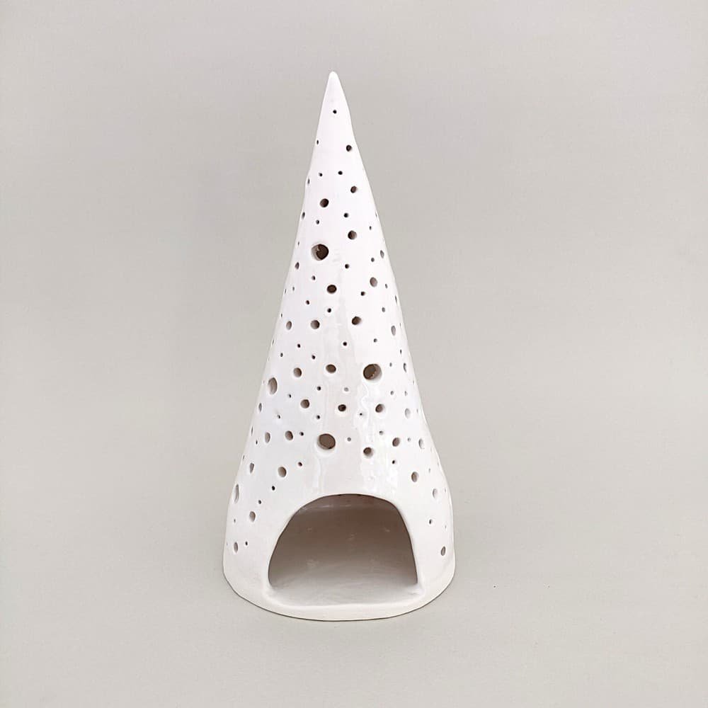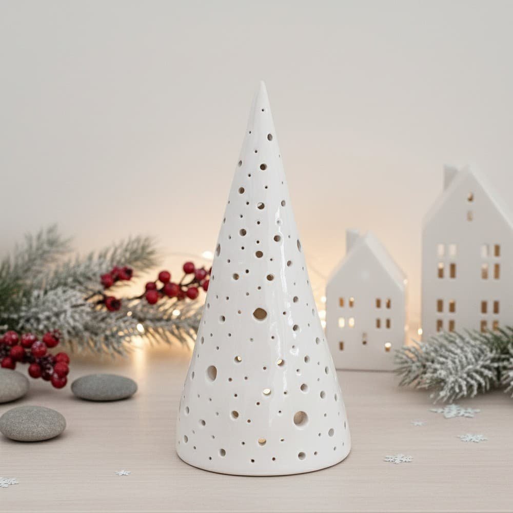 Ένα κομψό χειροποίητο κεραμικό δέντρο που συνδυάζει τη γιορτινή ατμόσφαιρα με τη σκανδιναβική αισθητική του minimalism. Το λευκό κωνικό δοχείο διαθέτει διάτρητα σχέδια που δημιουργούν μαγευτικά παιχνίδια φωτός όταν τοποθετήσετε ένα ρεσώ στο εσωτερικό του.​