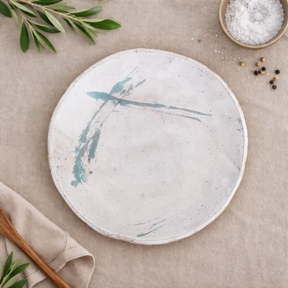 Κεραμικό πιάτο φαγητού, φτιαγμένο στο χέρι από stoneware πηλό, με απαλή off–white ματ υάλωση και διακριτικές πινελιές σε γαλάζιο.