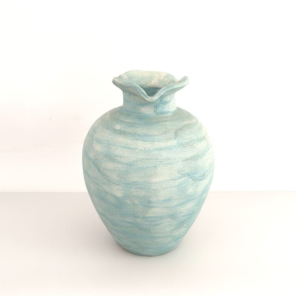 Ένα εντυπωσιακό χειροποίητο κεραμικό βάζο που συνδυάζει γλυπτική κομψότητα με παράκτια χρώματα. Το χαρακτηριστικό κυματιστό χείλος δημιουργεί μια οργανική, ρευστή κίνηση που προσθέτει καλλιτεχνική φινέτσα και απαλή κομψότητα στο σχεδιασμό.