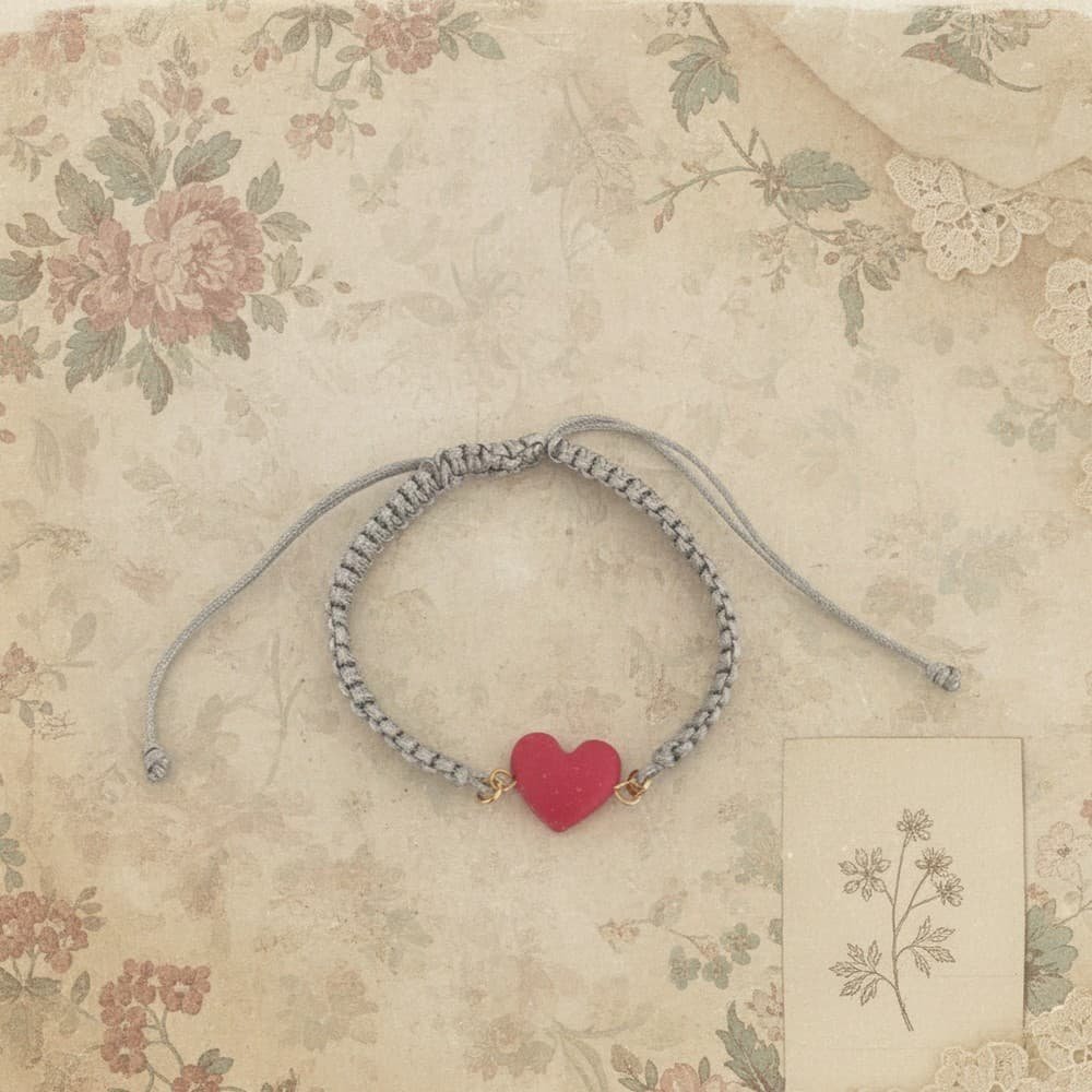 Χειροποίητο μακραμέ βραχιόλι σε γκρι κορδόνι, με κεντρικό στοιχείο κόκκινη καρδιά από πολυμερικό πηλό, ιδανικό για να το φοράς μόνο του ή σε συνδυασμό με άλλα βραχιολάκια.