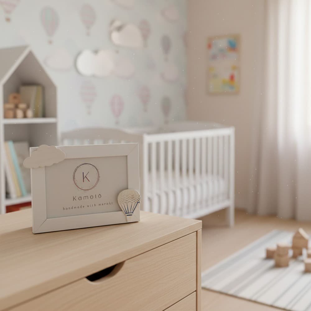 Γλυκιά παιδική κορνίζα χειροποίητη, σε λευκό χρώμα, διακοσμημένη με κεραμικό συννεφάκι και αερόστατο, ιδανική για να «αγκαλιάσει» τις αγαπημένες φωτογραφίες του μωρού.