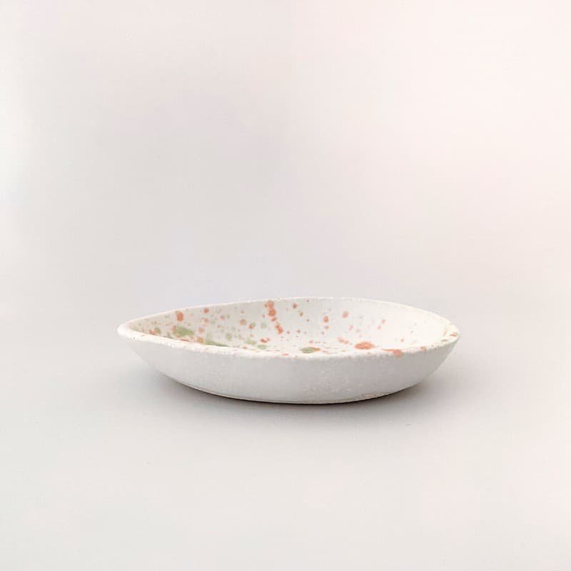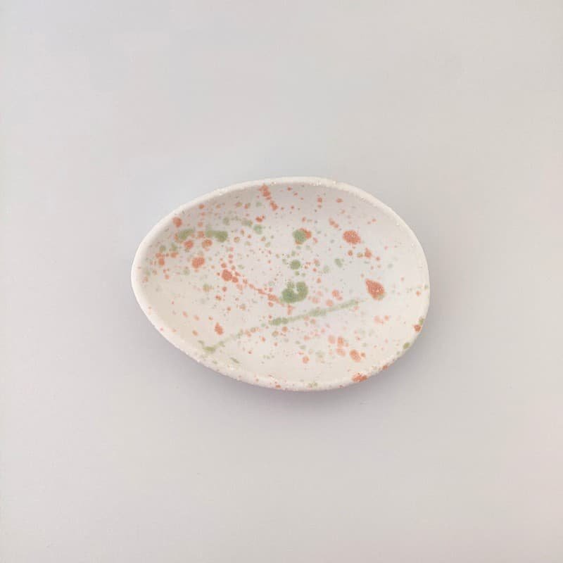 Ρηχό πιατάκι σε πασχαλινό οβάλ σχήμα, λευκή βάση με πιτσιλιές σε ροζ και πράσινο χρώμα – φρέσκο, ανοιξιάτικο εφέ με ματ υφή.