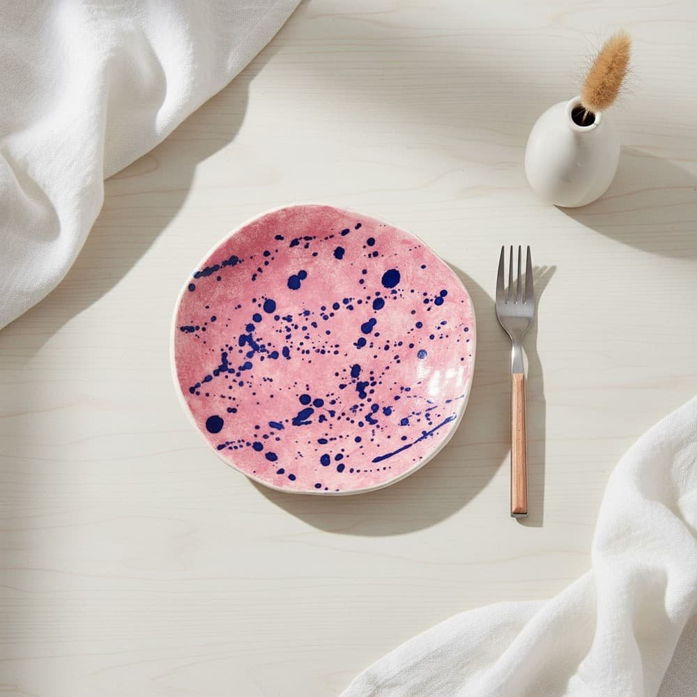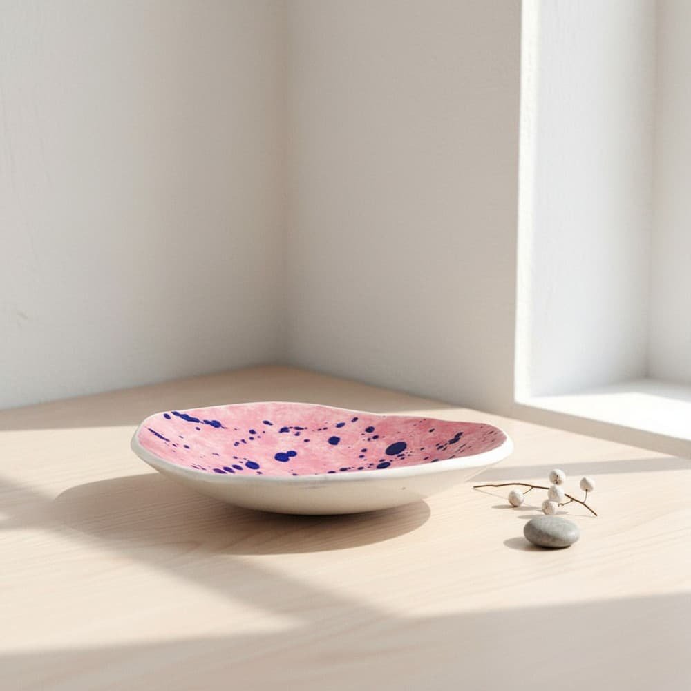 Η μοντέρνα αισθητική του πιάτου συνδυάζει την απαλότητα του ροζ με τα έντονα μπλε στίγματα που δημιουργούν ένα δυναμικό και παιχνιδιάρικο εφέ. Το αποτέλεσμα είναι ένα vintage-inspired κομμάτι που ταιριάζει τόσο σε σύγχρονες όσο και σε bohemian διακοσμήσεις.