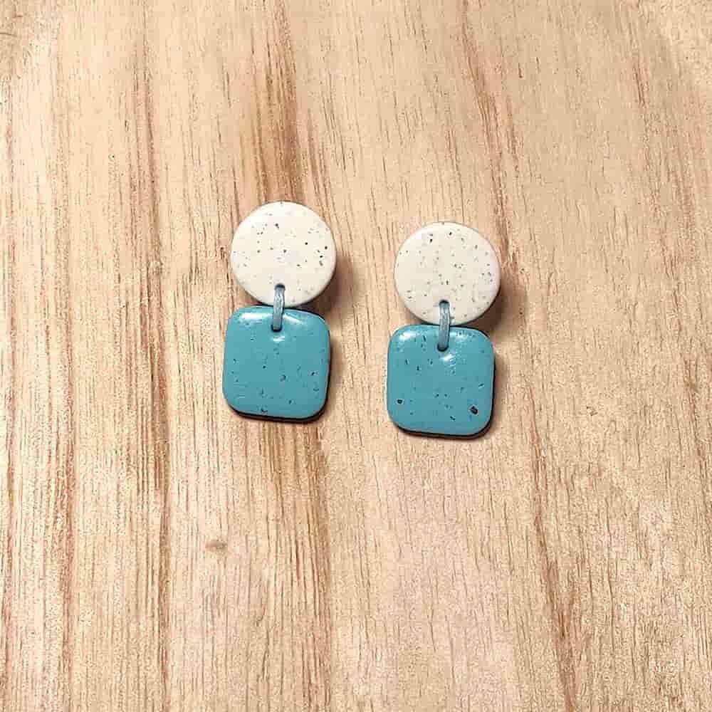 Δροσερά, μίνιμαλ σκουλαρίκια από πολυμερικό πηλό σε διχρωμία λευκού με πιτσιλιές και τιρκουάζ, με σύνθεση στρογγυλού πάνω στοιχείου και μικρού τετράγωνου με στρογγυλεμένες γωνίες που χαρίζει καθαρή, σύγχρονη γραμμή.