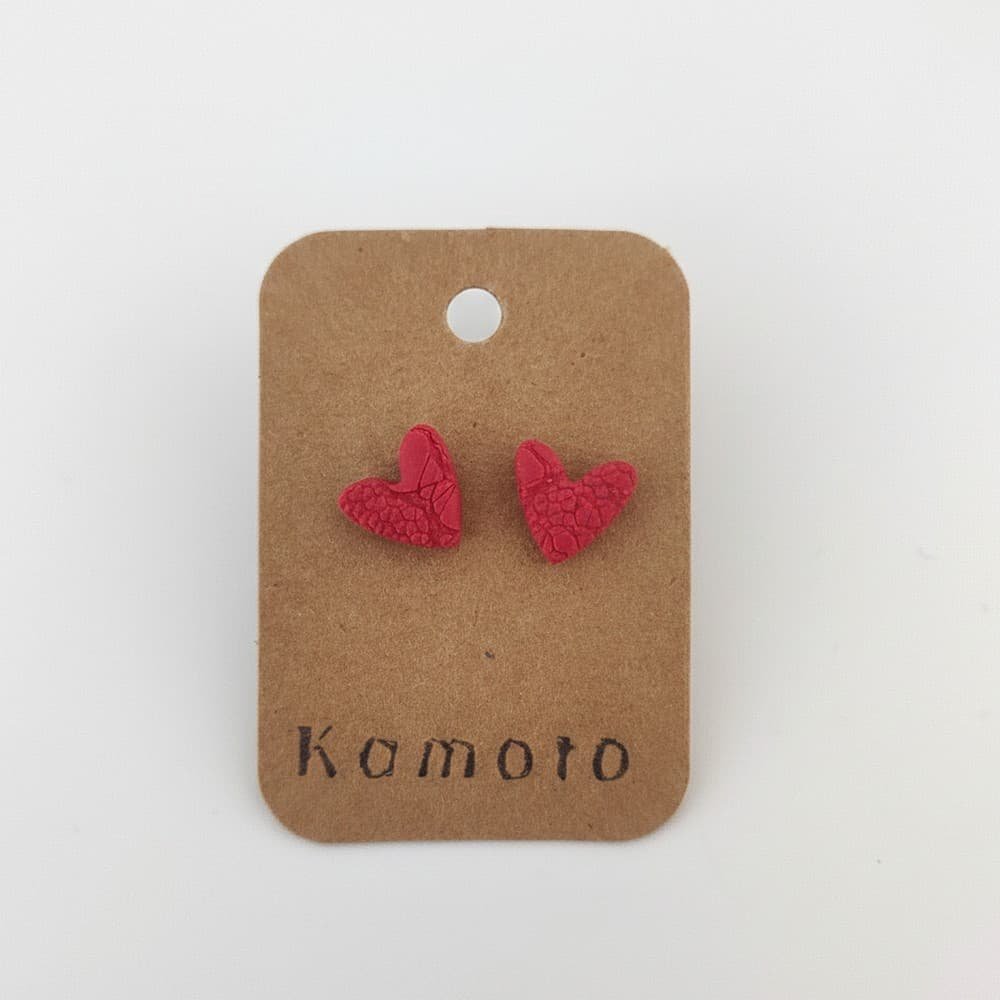 Μικρά καρφωτά σκουλαρίκια σε βαθύ κόκκινο, με χειροποίητες καρδιές από πολυμερικό πηλό και ανάγλυφη υφή που τονίζει τον ρομαντικό τους χαρακτήρα.